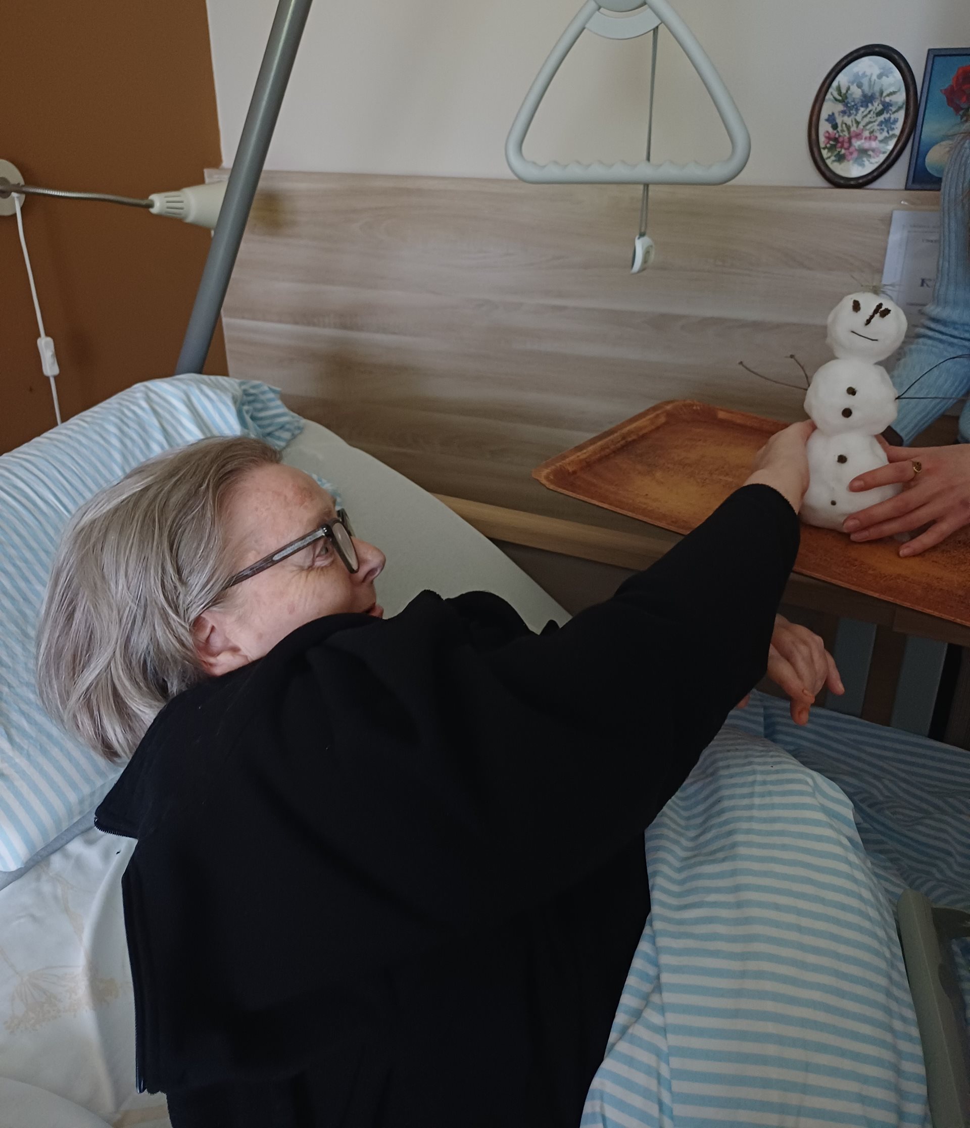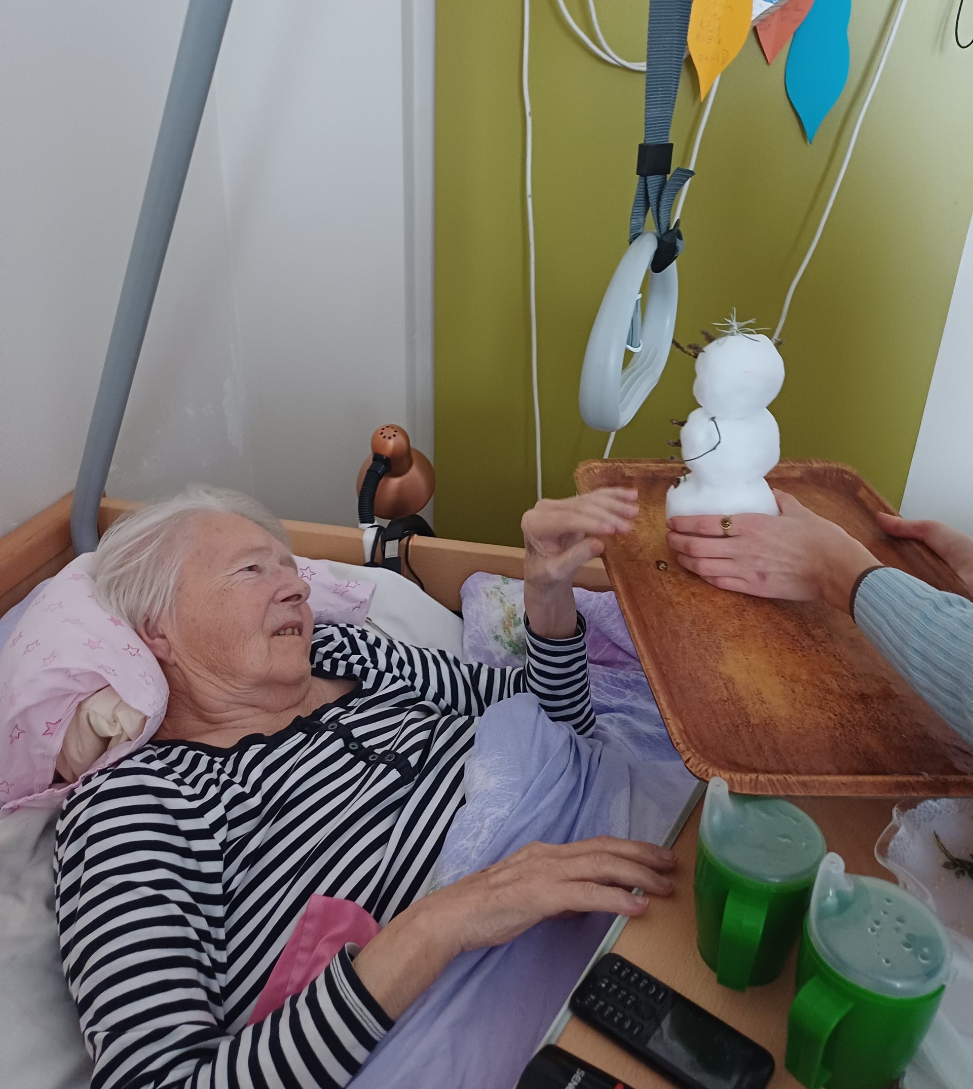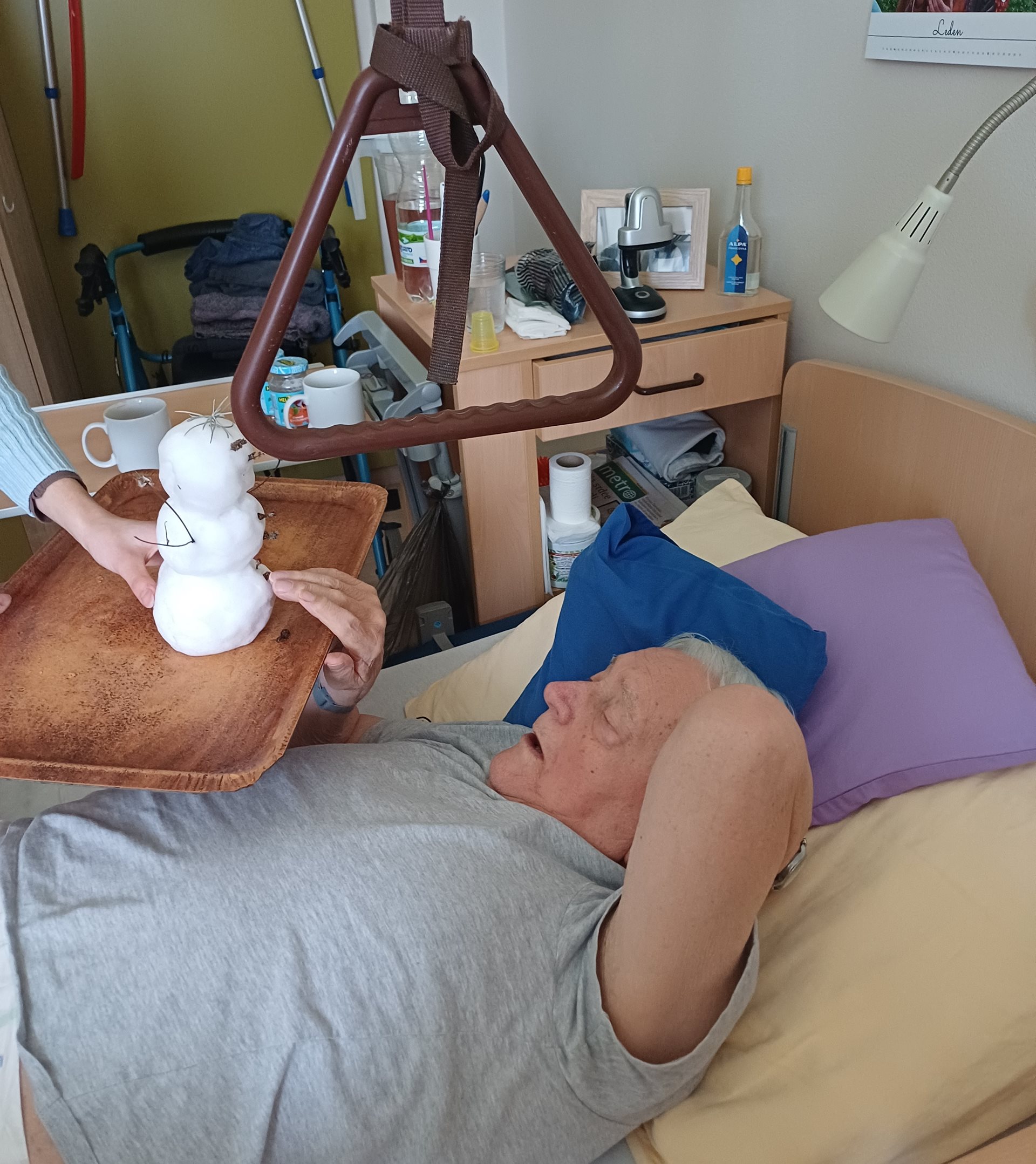 Aby si i imobilní klienti mohli vychutnat kouzlo zimy, vytvořila naše aktivizační pracovnice sněhuláčka přímo u Domova.